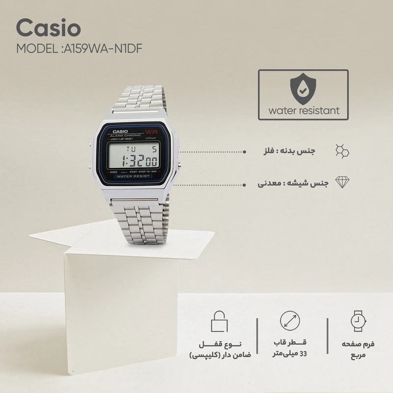 وقتی به دنبال ترکیب بینقصی از استایل کلاسیک و کارایی مدرن هستید، ساعت مچی کاسیو مدل A159WA-1D بهترین انتخاب شماست. طراحی زیبا با بند استیل مقاوم، مناسب برای هر دو جنس، و با ضمانت ۱۰ ساله باتری، این ساعت نه تنها زمان را نشان میدهد، بلکه شخصیت شما را نیز برجسته میکند. فرصت را از دست ندهید و همین امروز درخشش را تجربه کنید!