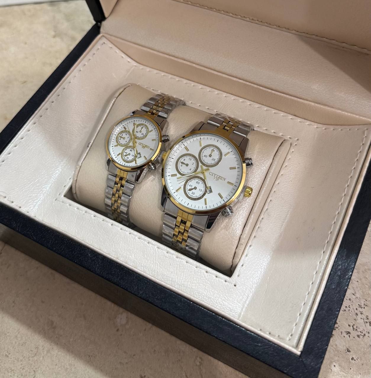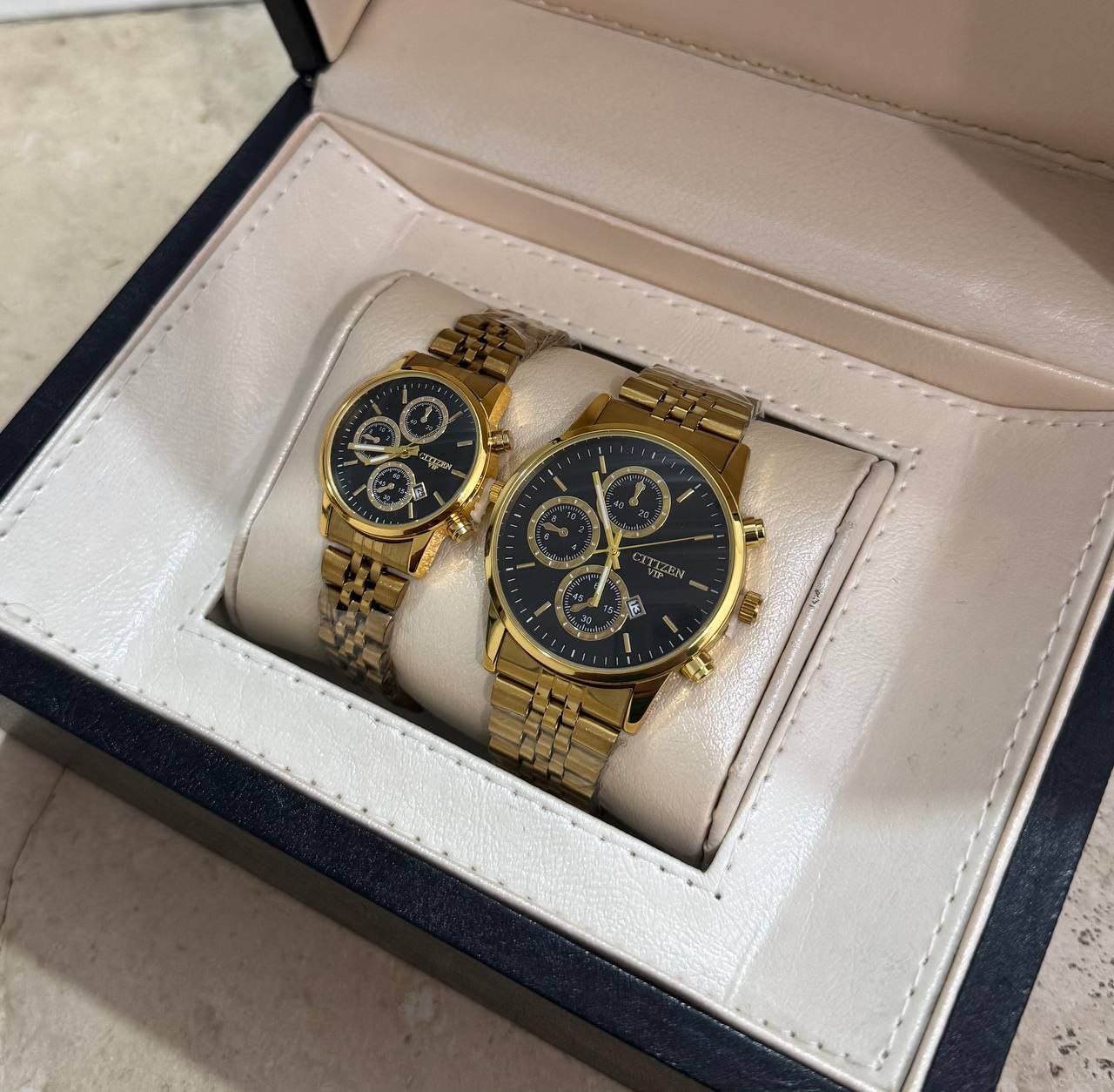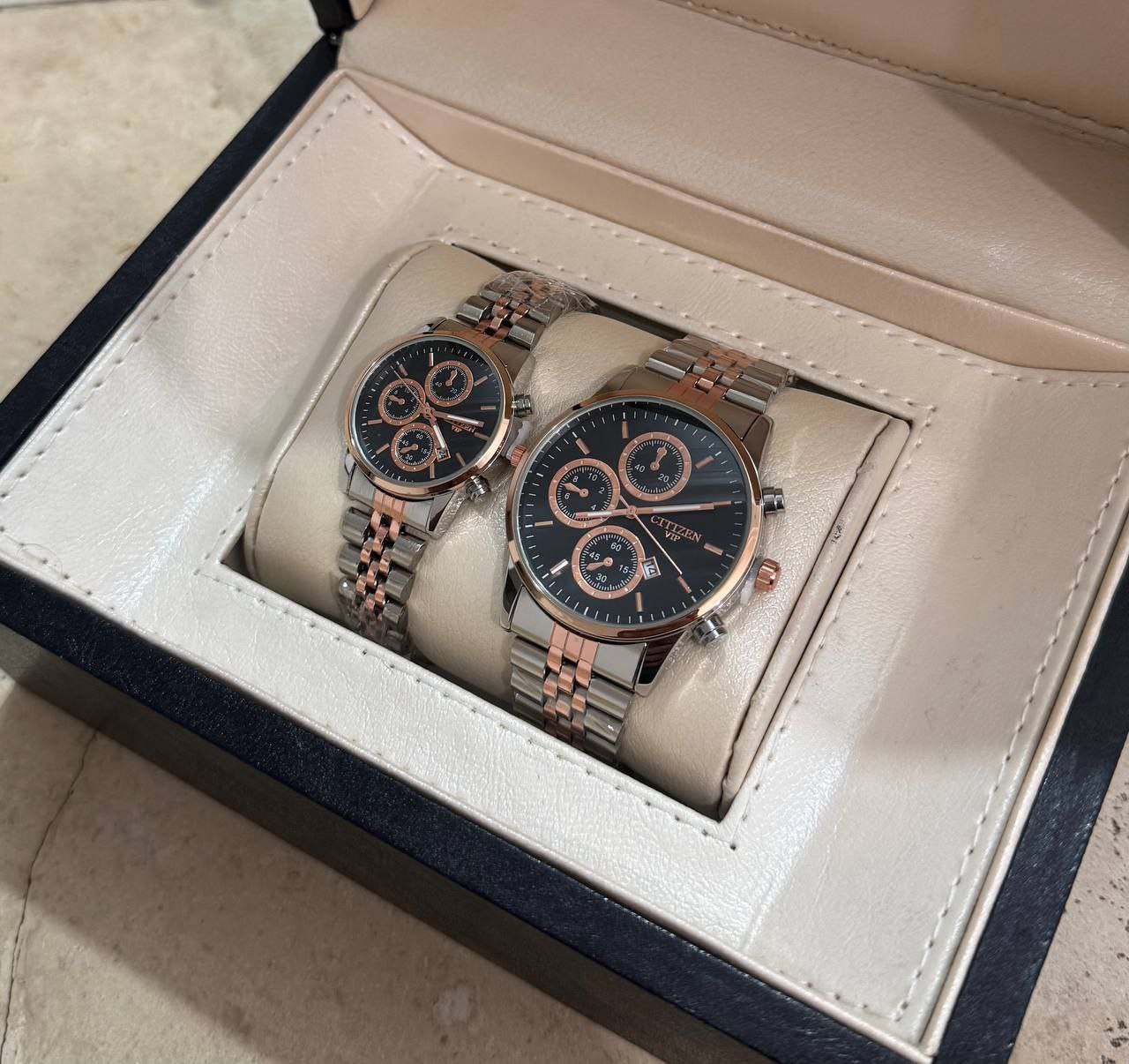 درخشش بینظیر و همگام با زمان با ست ساعت مچی زنانه و مردانه طلایی CITIZEN VIP. طراحی شیک و مدرن با بند استیل مقاوم، ایدهآل برای زوجهایی که به دنبال استایل هماهنگ و لاکچری هستند. دقیق، با دوام و خاص، این ست انتخابی بینظیر برای هدیهای ماندگار و جذاب است. همین حالا خرید کنید و بدرخشید!